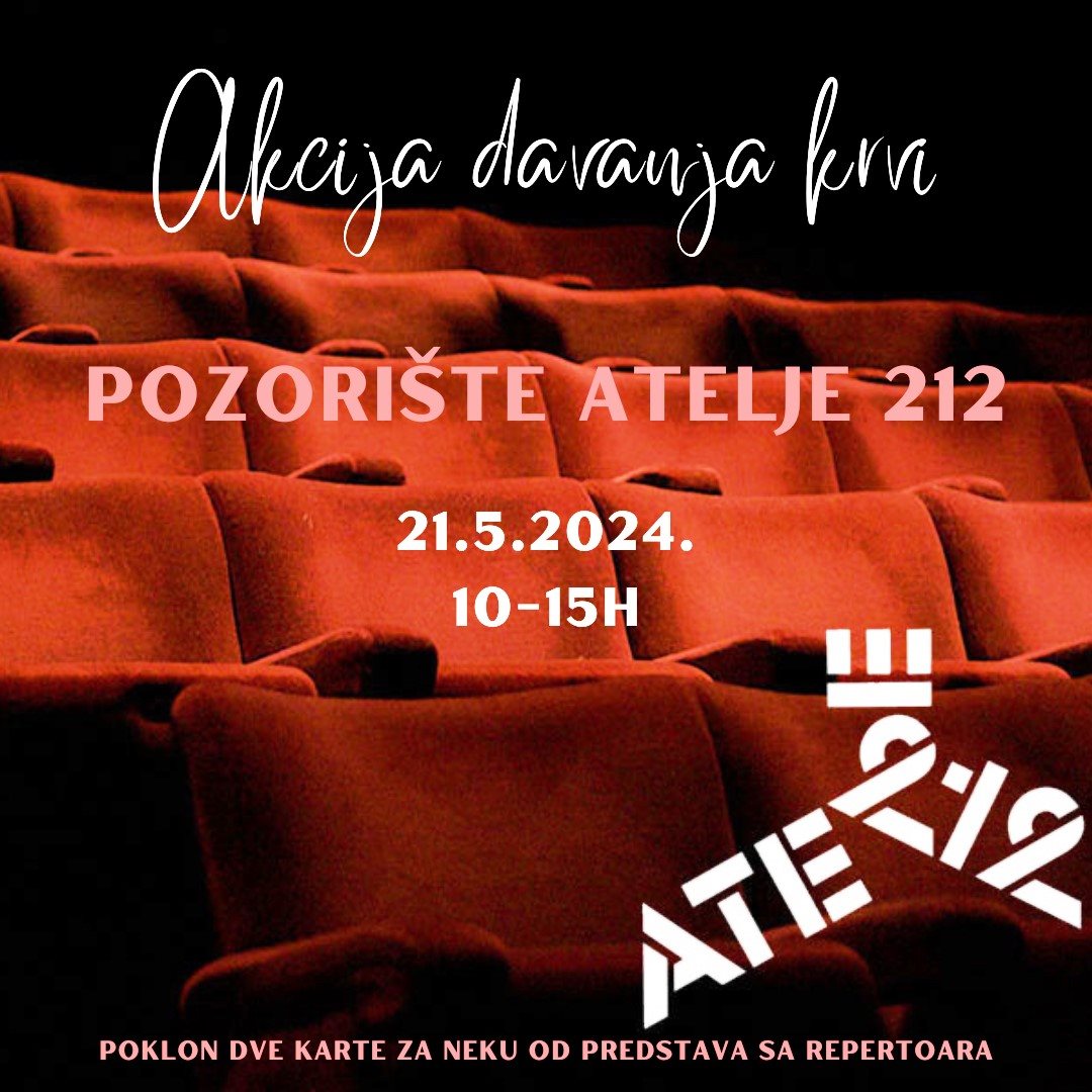 Институт за трансфузију крви Србије и Атеље 212 настављају традиционалну сарадњу у промоцији хуманости. У уторак, 21. маја, одржаће се акција добровољног давања крви од 10 до 15 часова у Атељеу 212. За све даваоце крви управа позоришта обезбедила је мали знак пажње, две карте за једну од представа из њиховог репертоара.