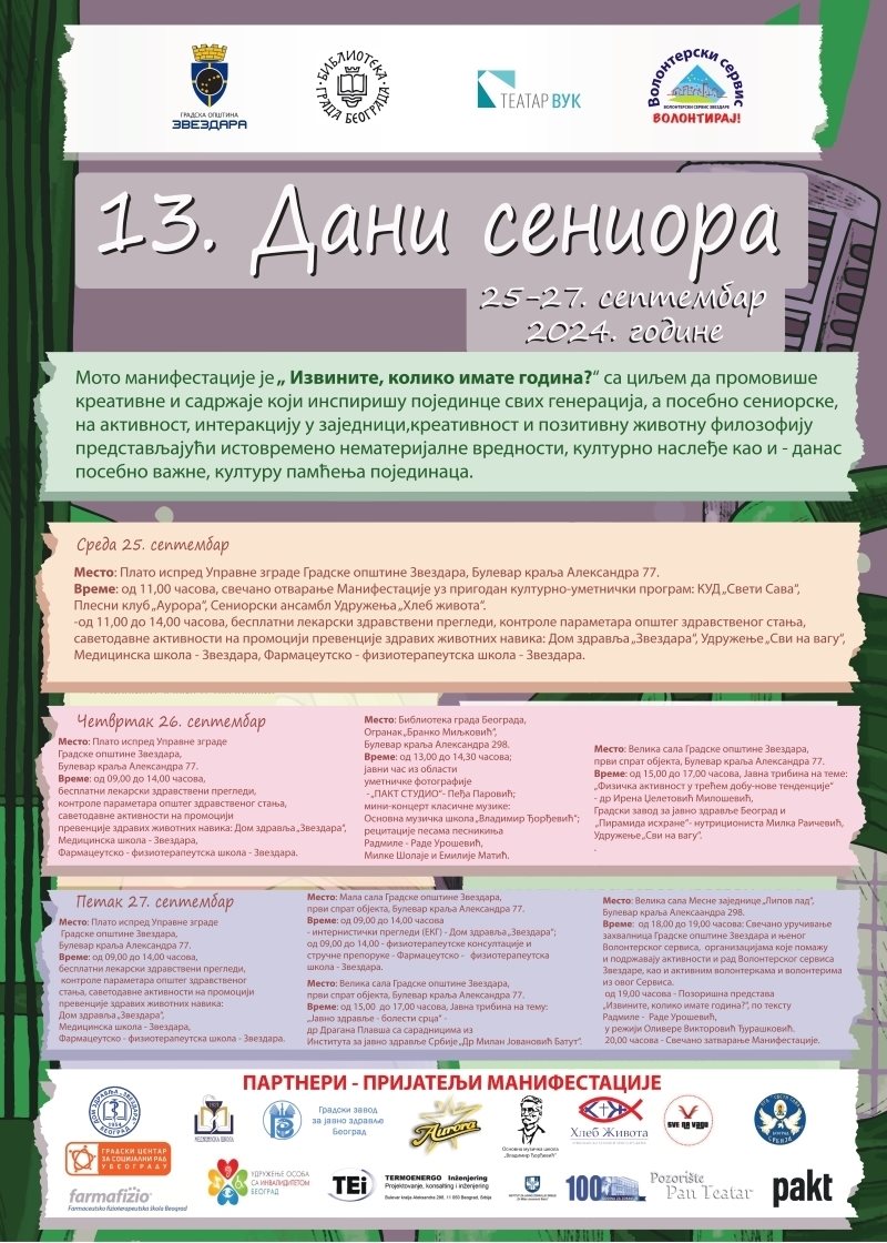 Свечано отварање манифестације биће у среду, 25. септембра, у 11 сати на платоу испред Градске општине Звездара у Булевару краља Александра 77. Свечано затварање манифестације биће у петак, 27. септембра, када ће се у Великој сали Месне заједнице „Липов лад”, Булевар краља Александра 298, у 19 сати одиграти позоришна представа „Извините, колико имате година?”, по тексту Радмиле Урошевић и у режији Оливере Викторовић Ђурашковић.