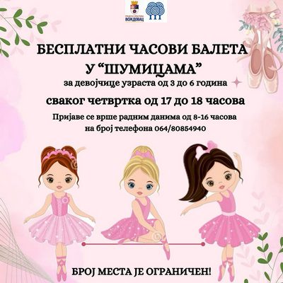 Бесплатни часови балета за девојчице, узраста од три до шест година, биће организовани сваког четвртка од 17 до 18 часова у Установи „Вождовачки центар – Шумице”. Девојчице ће учити основе балета и припремати кореографије прилагођене њиховом узрасту, развијајући истовремено своју музикалност и грациозност.