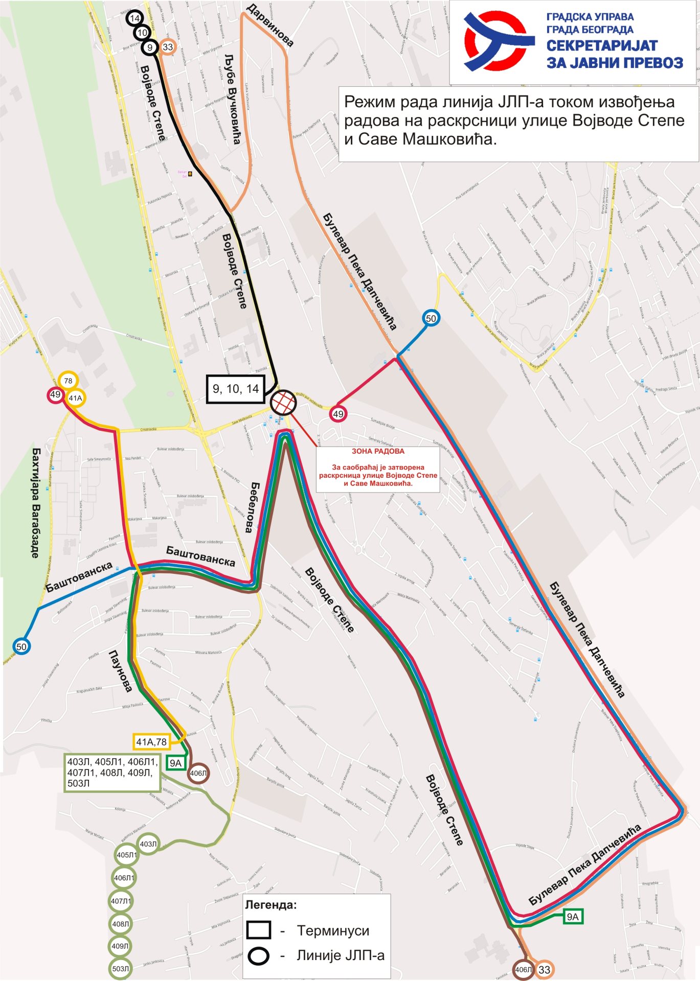 – аутобуска линија 50 – у оба смера аутобуси ће саобраћати улицама Вождовачким кружним путем, Булеваром Пека Дапчевића, Војводе Степе, интерном саобраћајницом у зони терминуса „Вождовац”, Бебеловом, Баштованском, Бахтијара Вагабзаде и даље редовном трасом;