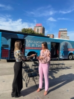 Аутобус за вакцинацију испред ТЦ „Ушће”