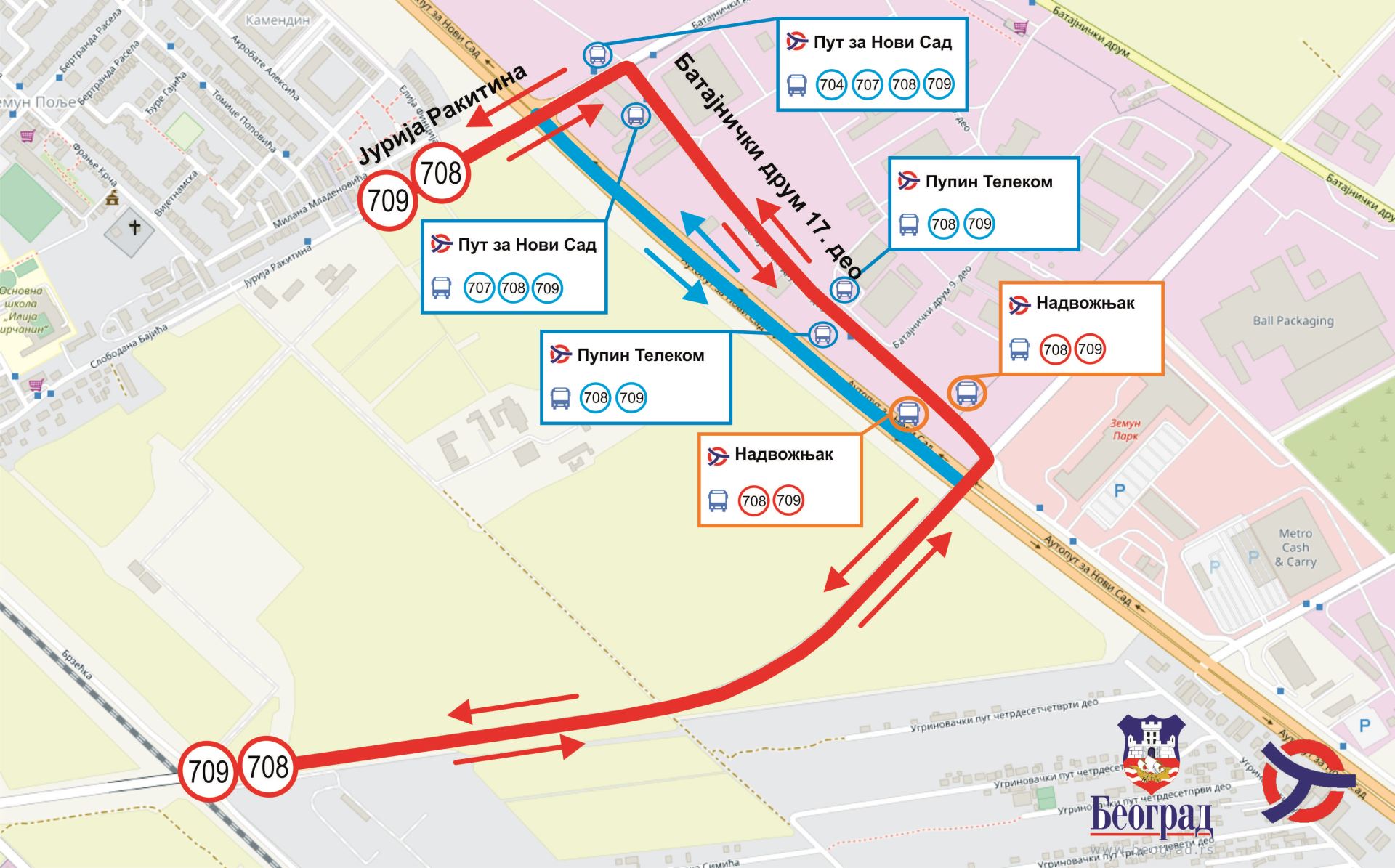 Autobuske linije 708 – Novi Beograd (Blok 70A) – Zemun polje i 709 – Zemun (Novi grad) – Zemun polje će saobraćati iz Kurirske ulice preko novoizgrađenog nadvožnjaka u produžetku ulice S10 do Batajničkog druma 17. deo, Batajničkim drumom 17. deo i dalje preko Ulice Jurija Rakitina do Zemun polja.