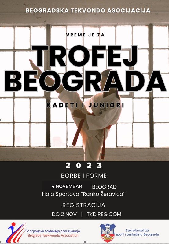 Takmičenje u tekvondu, u okviru manifestacije „Trofej Beograda 2023”, u organizaciji Beogradske tekvondo asocijacije i Sekretarijata za sport i omladinu biće održano u subotu, 4. novembra, u Hali sportova „Ranko Žeravica” u Novom Beogradu, saopšteno je iz ovog sekretarijata.