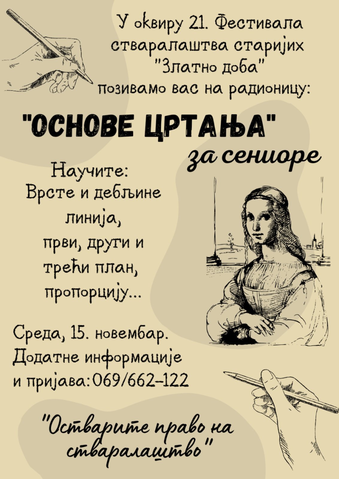 Zahvaljujući praktičnom radu i predavanju upoznaće se sa osnovama crtanja kao što su: vrste i debljine linija, vrste olovaka, prvi, drugi i treći plan, proporcija… Radionica će biti održana u sredu, 15. novembra, u Dnevnom centru i klubu za starije „Savski venac 3”. Dodatne informacije i prijave na broj telefona: 069/662-122.