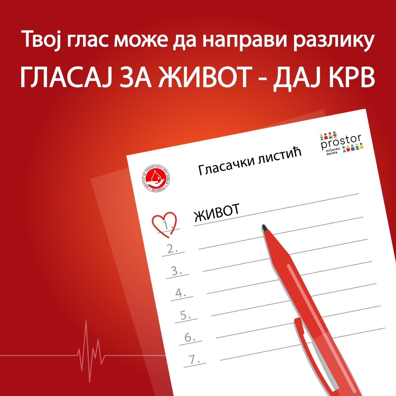 Institut za transfuziju krvi Srbije organizuje akciju dobrovoljnog davanja krvi sutra u Prostoru „Miljenko Dereta”, Dobračina 55, od 11 do 17 časova. Slogan akcije je „Tvoj glas može da napravi razliku – glasaj za život, daj krv”.
