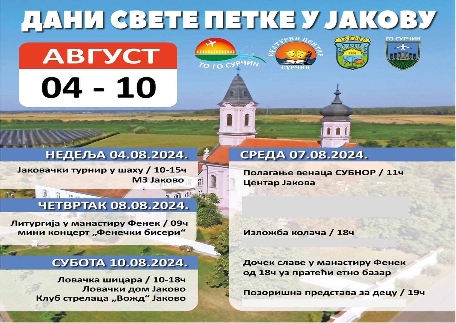 Naselje Jakovo proslavlja svoju slavu manifestacijom i svečanim programom „Dani Svete Petke u Jakovu” do 10. avgusta, saopšteno je iz Opštine Surčin.